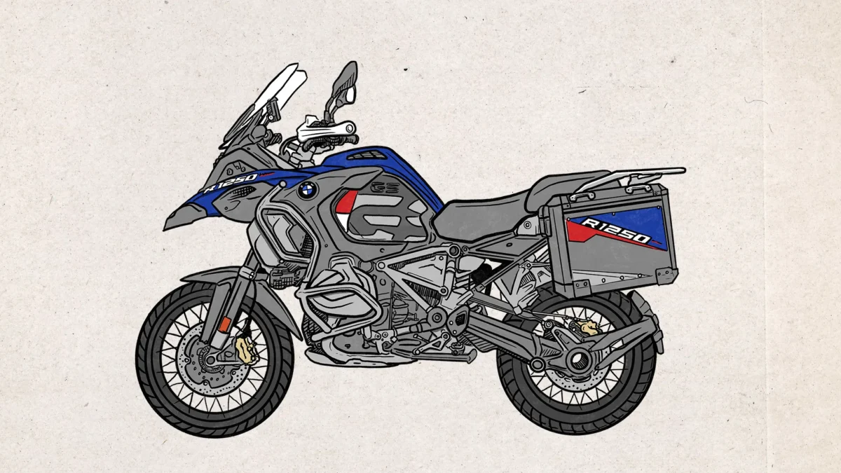 This custom illustration highlights the bold and capable design of the 2024 BMW R 1250 GS Adventure. Key elements include:
